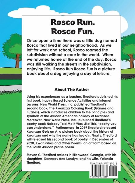 Once upon a time there was a little dog named Rosco that lived in our neighborhood. As we left for work and school, Rosco roamed the subdivision without a care in the world. When we returned home at the end of the day, Rosco was still walking the streets in the subdivision, enjoying life. Rosco Run. Rosco Fun. is a picture book about a dog enjoying a day of leisure, such as sunbathing at the pool and riding his bicycle, in a neighborhood.