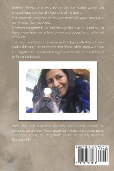 Roscoe Phoenix is a story based on true events, written with unconditional love for all inhabitants of the earth. It describes the resilience of a boston terrier who would never give up his search for happiness. It reflects on gratefulness, that through the love of a pet we as humans can learn better how to love and accept each other just as we are. The story's motivation is to inspire us to enjoy quality time with pets and build happy memories over their lifetime while aging with them. It is targeted for people of all ages to read aloud, as a family, or to larger audiences.
