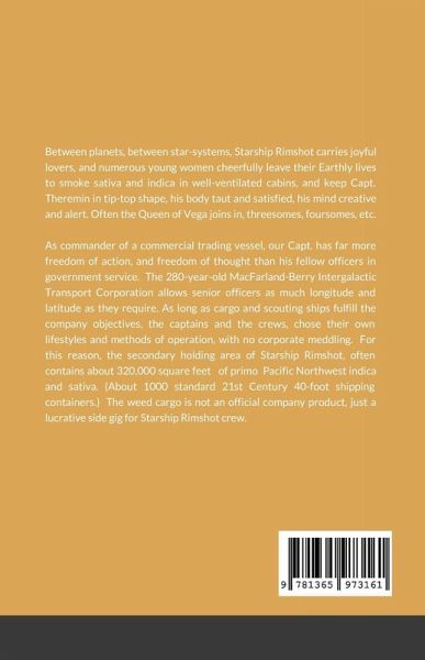 Between planets, between star-systems, Starship Rimshot carries joyful lovers, and numerous young women cheerfully leave their Earthly lives to smoke sativa and indica in well-ventilated cabins, and keep Capt. Theremin in tip-top shape, his body taut and satisfied, his mind creative and alert. Often the Queen of Vega joins in, threesomes, foursomes, etc. As commander of a commercial trading vessel, our Capt. has far more freedom of action, and freedom of thought than his fellow officers in government service. The 280-year-old MacFarland-Berry Intergalactic Transport Corporation allows senior officers as much longitude and latitude as they require. As long as cargo and scouting ships fulfill the company objectives, the captains and the crews, chose their own lifestyles and methods of operation, with no corporate meddling. For this reason, the secondary holding area of Starship Rimshot, often contains about 320,000 square feet of primo Pacific Northwest indica and sativa. (About 1000 standard 21st Century 40-foot shipping containers.) The weed cargo is not an official company product, just a lucrative side gig for Starship Rimshot crew.