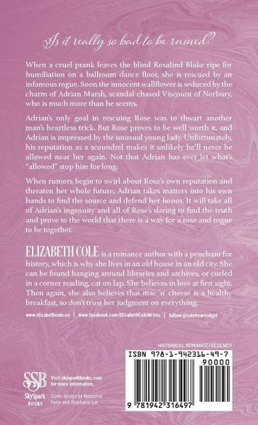 Is it really so bad to be ruined? When a cruel prank leaves the blind Rosalind Blake ripe for humiliation on a ballroom dance floor, she is rescued by an infamous rogue. Soon the innocent wallflower is seduced by the charm of Adrian Calwell, the scandal-chased Baron of Norbury, who is much more than he seems. Adrian's only goal in rescuing Rose was to thwart another man's heartless trick. But Rose proves to be well worth it, and Adrian is impressed by the unusual young lady. Unfortunately, his reputation as a scoundrel makes it unlikely he'll never be allowed near her again. Not that Adrian has ever let what's "allowed" stop him for long. When rumors begin to swirl about Rose's own reputation and threaten her whole future, Adrian takes matters into his own hands to find the source and defend her honor. It will take all of Adrian's ingenuity and all of Rose's daring to find the truth and prove to the world that there is a way for a rose and rogue to be together. The Wallflowers of Wildwood series follows five young women as they leave their beloved boarding school and venture out into the cutthroat world of the marriage mart. Get ready, London. These wallflowers are wilder than you think!