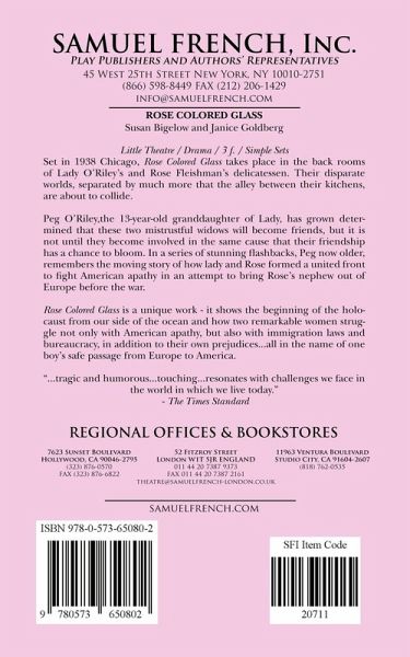 Full Length, Drama / 3f / Simple Sets Set in 1938 Chicago, Rose Colored Glass takes place in the back rooms of Lady O'Riley's and Rose Fleishman's delicatessen. Their disparate worlds, separated by much more that the alley between their kitchens, are about to collide. Peg O'Riley, the 13-year-old granddaughter of Lady, has grown determined that these two mistrustful widows will become friends, but it is not until they become involved in the same cause that their friendship has a chance to blo