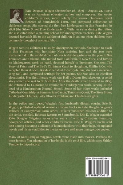 This short story is about a young, beautiful girl with all the choice of men at her feet. Through the story she grows out of her selfish desires and vain idols and realizes what is truly important and beautiful in another's character and to a better understanding of what love really means. It is also the story of a young man, though not the most handsome man around, yet the one with the most handsome and self-sacrificing character and love around. There are some flaws in the story concerning other characters, but they don't detract too much from the beauty of the story. (Emily) About the author: Kate Douglas Wiggin (September 28, 1856 - August 24, 1923) was an American educator, author and composer. She wrote children's stories, most notably the classic children's novel Rebecca of Sunnybrook Farm, and composed collections of children's songs. She started the first free kindergarten in San Francisco in 1878 (the Silver Street Free Kindergarten). With her sister during the 1880s, she also established a training school for kindergarten teachers. Kate Wiggin devoted her adult life to the welfare of children in an era when children were commonly thought of as cheap labor. Wiggin went to California to study kindergarten methods. She began to teach in San Francisco with her sister Nora assisting her, and the two were instrumental in the establishment of over 60 kindergartens for the poor in San Francisco and Oakland. She moved from California to New York, and having no kindergarten work on hand, devoted herself to literature. She sent The Story of Patsy and The Bird's Christmas Carol to Houghton, Mifflin & Co. who accepted them at once. Besides the talent for story-telling, she was a musician, sang well, and composed settings for her poems. She was also an excellent elocutionist. Her first literary work was Half a Dozen Housekeepers, a serial story which she sent to St. Nicholas. After the death of her husband in 1889, she returned to California to resume her kindergarten work, serving as the head of a Kindergarten Normal School. Some of her other works included Cathedral Courtship, A Summer in a Canon, Timothy's Quest, The Story Hour, Kindergarten Chimes, Polly Oliver's Problem, and Children's Rights. In the 1980s and 1990s, Wiggin's first husband's distant cousin, Eric E. Wiggin, published updated versions of some books in Kate Douglas Wiggin's Rebecca of Sunnybrook Farm series. He later published his own addition to the series, entitled, Rebecca Returns to Sunnybrook. Eric E. Wiggin extended Kate Douglas Wiggin's series after years of writing Christian literature, newspaper articles, and other children's books. Eric E. Wiggin's books sold best among his target audience of homeschoolers; with their help, his updated novels and his new addition to the series have sold more than 50,000 copies. Many of Kate Douglas Wiggin's novels were made into movies. Perhaps the most famous film adaptation of her books is the 1938 film, which stars Shirley Temple. (wikipedia.org)