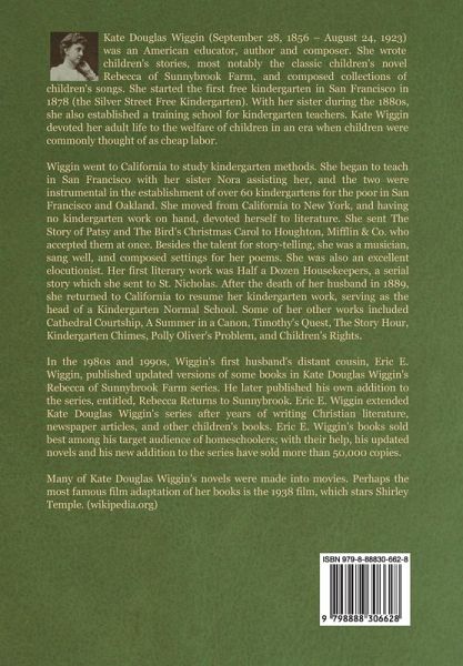 This short story is about a young, beautiful girl with all the choice of men at her feet. Through the story she grows out of her selfish desires and vain idols and realizes what is truly important and beautiful in another's character and to a better understanding of what love really means. It is also the story of a young man, though not the most handsome man around, yet the one with the most handsome and self-sacrificing character and love around. There are some flaws in the story concerning other characters, but they don't detract too much from the beauty of the story. (Emily) About the author: Kate Douglas Wiggin (September 28, 1856 - August 24, 1923) was an American educator, author and composer. She wrote children's stories, most notably the classic children's novel Rebecca of Sunnybrook Farm, and composed collections of children's songs. She started the first free kindergarten in San Francisco in 1878 (the Silver Street Free Kindergarten). With her sister during the 1880s, she also established a training school for kindergarten teachers. Kate Wiggin devoted her adult life to the welfare of children in an era when children were commonly thought of as cheap labor. Wiggin went to California to study kindergarten methods. She began to teach in San Francisco with her sister Nora assisting her, and the two were instrumental in the establishment of over 60 kindergartens for the poor in San Francisco and Oakland. She moved from California to New York, and having no kindergarten work on hand, devoted herself to literature. She sent The Story of Patsy and The Bird's Christmas Carol to Houghton, Mifflin & Co. who accepted them at once. Besides the talent for story-telling, she was a musician, sang well, and composed settings for her poems. She was also an excellent elocutionist. Her first literary work was Half a Dozen Housekeepers, a serial story which she sent to St. Nicholas. After the death of her husband in 1889, she returned to California to resume her kindergarten work, serving as the head of a Kindergarten Normal School. Some of her other works included Cathedral Courtship, A Summer in a Canon, Timothy's Quest, The Story Hour, Kindergarten Chimes, Polly Oliver's Problem, and Children's Rights. In the 1980s and 1990s, Wiggin's first husband's distant cousin, Eric E. Wiggin, published updated versions of some books in Kate Douglas Wiggin's Rebecca of Sunnybrook Farm series. He later published his own addition to the series, entitled, Rebecca Returns to Sunnybrook. Eric E. Wiggin extended Kate Douglas Wiggin's series after years of writing Christian literature, newspaper articles, and other children's books. Eric E. Wiggin's books sold best among his target audience of homeschoolers; with their help, his updated novels and his new addition to the series have sold more than 50,000 copies. Many of Kate Douglas Wiggin's novels were made into movies. Perhaps the most famous film adaptation of her books is the 1938 film, which stars Shirley Temple. (wikipedia.org)