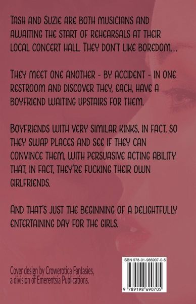 Tash and Suzie are both musicians and awaiting the start of rehearsals at their local concert hall. They don't like boredom... They meet one another - by accident - in one restroom and discover they, each, have a boyfriend waiting upstairs for them. Boyfriends with very similar kinks, in fact, so they swap places and see if they can convince them, with persuasive acting ability that, in fact, they're fucking their own girlfriends. And that's just the beginning of a delightfully entertaining day for the girls...