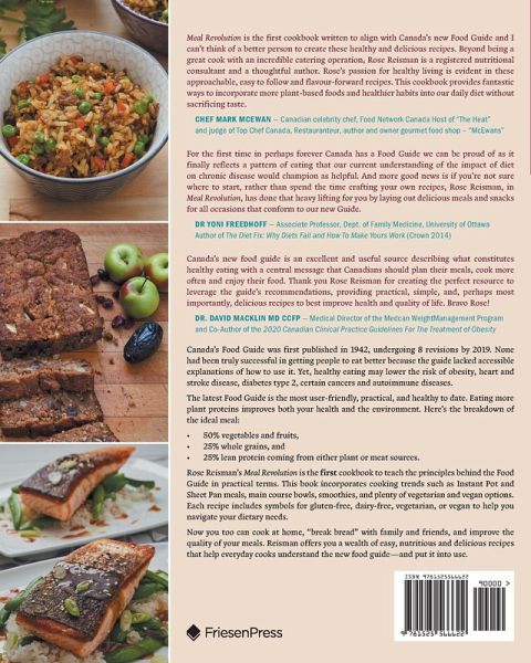 Canada's Food Guide was first published in 1942, undergoing 8 revisions by 2019. None had been truly successful in getting people to eat better because the guide lacked accessible explanations of how to use it. Yet, healthy eating may lower the risk of obesity, heart and stroke disease, diabetes type 2, certain cancers and autoimmune diseases. The latest Food Guide is the most user-friendly, practical, and healthy to date. Eating more plant proteins improves both your health and the environment. Here's the breakdown of the ideal meal: ¿ 50% vegetables and fruits, ¿ 25% whole grains, and ¿ 25% lean protein coming from either plant or meat sources. Rose Reisman's Meal Revolution is the first cookbook to teach the principles behind the Food Guide in practical terms. This book incorporates cooking trends such as Instant Pot and Sheet Pan meals, main course bowls, smoothies, and plenty of vegetarian and vegan options. Each recipe includes symbols for gluten-free, dairy-free, vegetarian, or vegan to help you navigate your dietary needs. Now you too can cook at home, "break bread" with family and friends, and improve the quality of your meals. Reisman offers you a wealth of easy, nutritious and delicious recipes that help everyday cooks understand the new food guide-and put it into use.