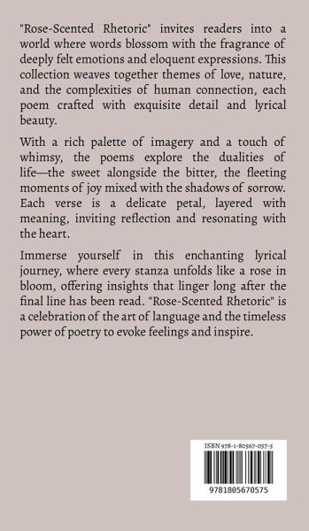 "Rose-Scented Rhetoric" invites readers into a world where words blossom with the fragrance of deeply felt emotions and eloquent expressions. This collection weaves together themes of love, nature, and the complexities of human connection, each poem crafted with exquisite detail and lyrical beauty. With a rich palette of imagery and a touch of whimsy, the poems explore the dualities of life-the sweet alongside the bitter, the fleeting moments of joy mixed with the shadows of sorrow. Each verse is a delicate petal, layered with meaning, inviting reflection and resonating with the heart. Immerse yourself in this enchanting lyrical journey, where every stanza unfolds like a rose in bloom, offering insights that linger long after the final line has been read. "Rose-Scented Rhetoric" is a celebration of the art of language and the timeless power of poetry to evoke feelings and inspire.