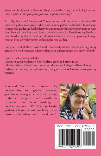 Roses are the Queen of Flowers. They're beautiful, fragrant, and elegant - and roses require all the pampering of a real Queen, don't they? Actually, they don't! Rose gardening can be easy and pleasant. I've worked 25 years in horticulture and cared for over 300 roses in a public rose garden when I was municipal horticulturist. I found ways to keep rose gardening fussbudgetry to a minimum while growing vigorous roses that bloomed their heads off. Rose to the Occasion: An Easy-Growing Guide to Rose Gardening shares tricks and shortcuts that rosarians use, plus simple ways you can keep up with your to-do list in the rose garden. Gardeners of all skill levels will find this book helpful, whether they be beginning gardeners or old rosarians, whether they have a green thumb or a brown thumb. Rose to the Occasion includes * old illustrations of roses in bloom, plus historical background on each flower * down-to-earth wisdom on how to plant, grow, and prune roses * the in and out of fertilizing roses to get the lushest foliage and best blooms * advice on choosing the right rose for your garden, as well as many easy-growing varieties * the latest on organic pest control and fungicide use in the rose garden * hardy, tough old roses that can take whatever Mother Nature throws at them * and general garden maintenance help that you can use anywhere in the garden. If you love The Rose Bible by Rayford Clayton Reddell, or books by David Austin, or books like Right Rose, Right Place; or Everyday Roses: How to Grow Knock Out® and Other Easy-Care Garden Roses; or The Organic Rose Garden, and if you like garden books leavened with humor -- then this book is for you.