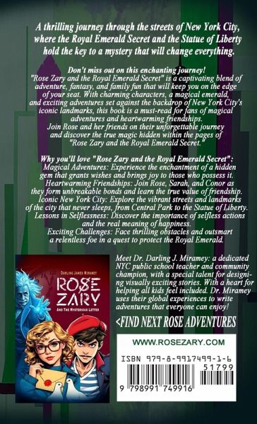 A thrilling journey through the streets of New York City, where the Royal Emerald Secret and the Statue of Liberty hold the key to a mystery that will change everything. Don't Miss Out on This Enchanting Journey! "Rose Zary and the Royal Emerald Secret" is a captivating blend of adventure, fantasy, and family fun that will keep you on the edge of your seat. With charming characters, a magical emerald, and exciting adventures set against the backdrop of New York City's iconic landmarks, this book is a must-read for fans of magical adventures and heartwarming friendships. Join Rose and her friends on their unforgettable journey and discover the true magic hidden within the pages of "Rose Zary and the Royal Emerald Secret." Why You'll Love "Rose Zary and the Royal Emerald Secret": ¿ Magical Adventures: Experience the enchantment of a hidden gem that grants wishes and brings joy to those who possess it. ¿ Heartwarming Friendships: Join Rose, Sarah, and Conor as they form unbreakable bonds and learn the true value of friendship. ¿ Iconic New York City: Explore the vibrant streets and landmarks of the city that never sleeps, from Central Park to the Statue of Liberty. ¿ Lessons in Selflessness: Discover the importance of selfless actions and the real meaning of happiness. ¿ Exciting Challenges: Face thrilling obstacles and outsmart a relentless foe in a quest to protect the Royal Emerald. What Readers Are Saying: "I couldn't put it down! The adventures were so exciting, and I loved the friendship between Rose, Sarah, and Conor." - Emma, age 10 "A perfect blend of magic and real-life lessons. My daughter and I loved reading it together." - Mom of Lily, age 8 "The best part was exploring New York City with the characters. It felt like I was right there with them!" - Max, age 11 Don't wait-embark on this enchanting adventure today and experience the magic for yourself!