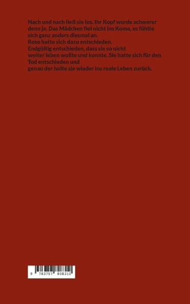 Nach und nach ließ sie los. Ihr Kopf wurde schwerer dennje. Das Mädchen fiel nicht ins Koma, es fühlte sich ganz anders diesmal an.Rose hatte sich dazu entschieden. Endgültig entschieden, dass sie so nichtweiter leben wollte und konnte. Sie hatte sich für den Tod entschieden undgenau der holte sie wieder ins reale Leben zurück.