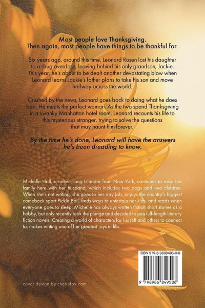 Most people love Thanksgiving. Then again, most people have things to be thankful for. Six years ago, around this time, Leonard Rosen lost his daughter to a drug overdose, leaving behind his only grandson, Jackie.This year, he's about to be dealt another devastating blow when Leonard learns Jackie's father plans to take his son and move halfway across the world. Crushed by the news, Leonard goes back to doing what he does best: He meets the perfect woman. As the two spend Thanksgiving in a swanky Manhattan hotel room, Leonard recounts his life to this mysterious stranger, trying to solve the questions that may haunt him forever. By the time he's done, Leonard will have the answers he's been dreading to know.