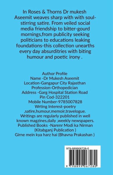 Thorn and Roses isn't here to enlighten you or sculpt your abs-it's here to tickle your funny bone and jab your thinking cap. Written by an orthopedic doctor-turned-satirist, this book is a bouquet of wit: fragrant, prickly, and disarmingly honest. From viral buffaloes to holy potholes, each piece is a self-contained detonation of humor. Read it to laugh, reflect, and maybe spot the fractures in society you never knew needed setting. Satire begins here.