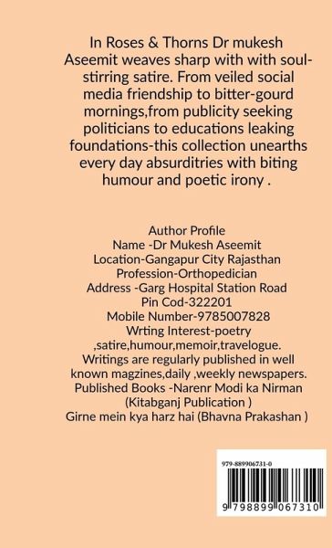 Thorn and Roses isn't here to enlighten you or sculpt your abs-it's here to tickle your funny bone and jab your thinking cap. Written by an orthopedic doctor-turned-satirist, this book is a bouquet of wit: fragrant, prickly, and disarmingly honest. From viral buffaloes to holy potholes, each piece is a self-contained detonation of humor. Read it to laugh, reflect, and maybe spot the fractures in society you never knew needed setting. Satire begins here.