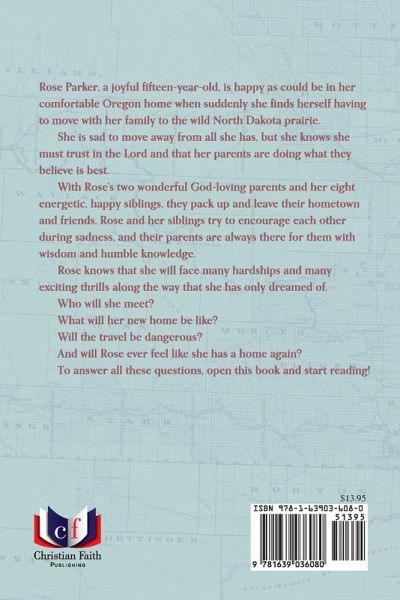 Rose Parker, a joyful fifteen-year-old, is happy as could be in her comfortable Oregon home when suddenly she finds herself having to move with her family to the wild North Dakota prairie. She is sad to move away from all she has, but she knows she must trust in the Lord and that her parents are doing what they believe is best. With Rose's two wonderful God-loving parents and her eight energetic, happy siblings, they pack up and leave their hometown and friends. Rose and her siblings try to encourage each other during sadness, and their parents are always there for them with wisdom and humble knowledge. Rose knows that she will face many hardships and many exciting thrills along the way that she has only dreamed of. Who will she meet? What will her new home be like? Will the travel be dangerous? And will Rose ever feel like she has a home again? To answer all these questions, open this book and start reading!
