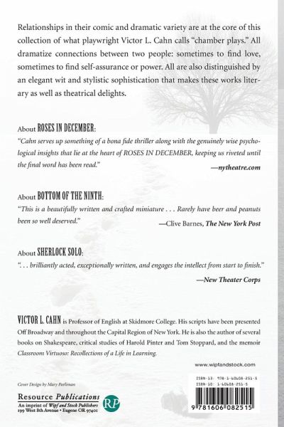 Relationships in their comic and dramatic variety are at the core of this collection of what playwright Victor L. Cahn calls "chamber plays." All dramatize relationships between two people: sometimes to find love, sometimes to find self-assurance or power. All are also distinguished by an elegant wit and stylistic sophistication that makes these works literary as well as theatrical delights.