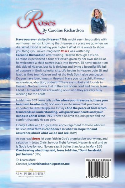 Have you ever visited Heaven? This might seem impossible with our human minds, knowing that Heaven is where we go when we die. What If God Is calling you higher? What If He wants to show you things you never imagined? After visiting Heaven through a vision, Caroline experienced a tour of Heaven given by her son, Ell, as he welcomed a child named Isaac Into Heaven. Eli never made it on this side of Heaven, but he is thriving and living a beautiful life full of purpose in God's celestial city. Life begins in Heaven. Join Ell and Isaac as they tour Heaven, and let the Holy Spirit give you peace. Do you have loved ones In Heaven? Have you lost a child through a miscarriage? abortion, or death? There are no lost and founds In Heaven. No one Is ever lost In the care of our Lord and Savior, Jesus Christ. Our loved ones are waiting for us; they are very busy working for the Lord! As you read Roses, let your faith in God's promises be your wings and salvation in Jesus Christ be your flight forward. Heaven Is real, and so is God's love for you. No one says it better than Jesus in Mark 5:36 Overhearing what they said, Jesus told him, "Don't be afraid; just believe." (NIV) To Leam More, Contact junecrichardson@proton.me