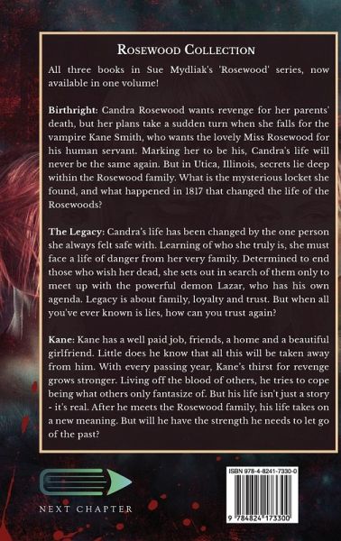 All three books in Sue Mydliak's 'Rosewood' series, now available in one volume! Birthright: Candra Rosewood wants revenge for her parents' death, but her plans take a sudden turn when she falls for the vampire Kane Smith, who wants the lovely Miss Rosewood for his human servant. Marking her to be his, Candra's life will never be the same again. But in Utica, Illinois, secrets lie deep within the Rosewood family. What is the mysterious locket she found, and what happened in 1817 that changed the life of the Rosewoods? The Legacy: Candra's life has been changed by the one person she always felt safe with. Learning of who she truly is, she must face a life of danger from her very family. Determined to end those who wish her dead, she sets out in search of them only to meet up with the powerful demon Lazar, who has his own agenda. Legacy is about family, loyalty and trust. But when all you've ever known is lies, how can you trust again? Kane: Kane has a well paid job, friends, a home and a beautiful girlfriend. Little does he know that all this will be taken away from him. With every passing year, Kane's thirst for revenge grows stronger. Living off the blood of others, he tries to cope being what others only fantasize of. But his life isn't just a story - it's real. After he meets the Rosewood family, his life takes on a new meaning. But will he have the strength he needs to let go of the past?
