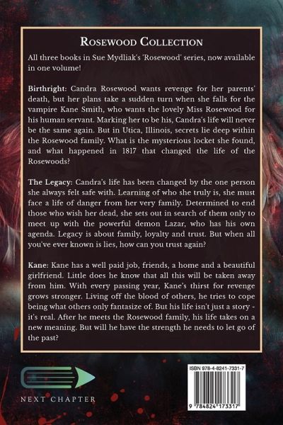 All three books in Sue Mydliak's 'Rosewood' series, now available in one volume! Birthright: Candra Rosewood wants revenge for her parents' death, but her plans take a sudden turn when she falls for the vampire Kane Smith, who wants the lovely Miss Rosewood for his human servant. Marking her to be his, Candra's life will never be the same again. But in Utica, Illinois, secrets lie deep within the Rosewood family. What is the mysterious locket she found, and what happened in 1817 that changed the life of the Rosewoods? The Legacy: Candra's life has been changed by the one person she always felt safe with. Learning of who she truly is, she must face a life of danger from her very family. Determined to end those who wish her dead, she sets out in search of them only to meet up with the powerful demon Lazar, who has his own agenda. Legacy is about family, loyalty and trust. But when all you've ever known is lies, how can you trust again? Kane: Kane has a well paid job, friends, a home and a beautiful girlfriend. Little does he know that all this will be taken away from him. With every passing year, Kane's thirst for revenge grows stronger. Living off the blood of others, he tries to cope being what others only fantasize of. But his life isn't just a story - it's real. After he meets the Rosewood family, his life takes on a new meaning. But will he have the strength he needs to let go of the past?