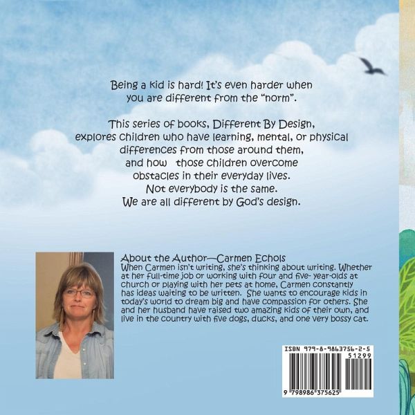 Being a kid is hard! It's even harder whenyou are different from the "norm".This series of books, Different By Design,explores children who have learning, mental, or physical differences from those around them,and how those children overcomeobstacles in their everyday lives.Not everybody is the same. We are all different by God's design.