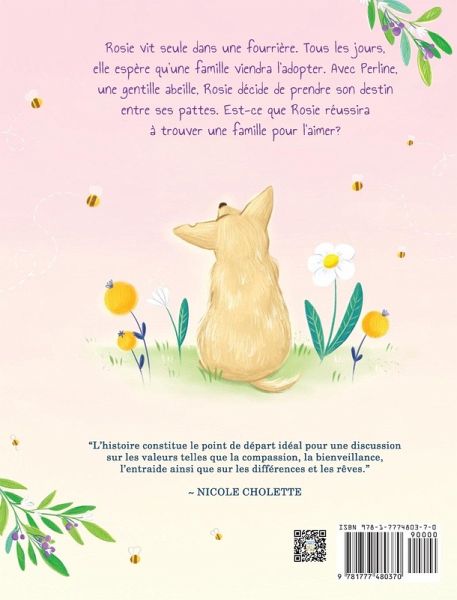 Rosie et Perle ont un lien improbable qui saura réchauffer vos COEURS! Dans Rosie s'enfuit, un chien abandonné et une gentille abeille unissent leurs forces pour réaliser le rêve de famille de Rosie. Rosie, qui vit dans une fourrière abandonnée, est déterminée à prendre son destin en main. Avec l'aide de Perle, Rosie se lance dans une aventure pour trouver sa vraie maison. Est-ce que Rosie réussira à trouver une famille pour l'aimer. Si vous voulez enseigner à vos enfants l'impact positif de la gentillesse, ce joli livre d'images est le bon choix pour vous. Qu'il s'agisse d'êtres humains, d'animaux ou de plantes, et quelle que soit leur taille, leur forme ou leur couleur, nous sommes interconnectés et avons tous la même valeur. Ce livre pour enfants sur la diversité et la gentillesse est rempli de magnifiques illustrations. Guidant à travers une histoire touchante et des dialogues avec un chien et une abeille, cette histoire aidera vos enfants à : · exprimer leur empathie, leur compassion et leur gratitude · atteindre leurs rêves · aider les personnes dans le besoin et apprécier la véritable amitié · accepter la diversité et l'importance de l'inclusion
