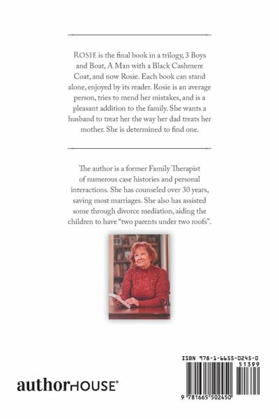 Rosie is the final book in a trilogy, 3 Boys and Boat, A Man with a Black Cashmere Coat, and now Rosie. Each book can stand alone, enjoyed by its reader. Rosie is an average person, tries to mend her mistakes, and is a pleasant addition to the family. She wants a husband to treat her the way her dad treats her mother. She is determined to find one.