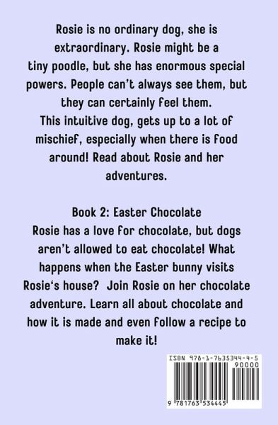 Rosie is no ordinary dog, she is extraordinary. Rosie might be a tiny poodle, but she has enormous special powers. People can't always see them, but they can certainly feel them. This intuitive dog gets up to a lot of mischief, especially when there is food around. Join Rosie on her adventures and learn along the way. Book 2: Easter Chocolate Rosie has a love for chocolate, but dogs aren't allowed to eat chocolate! What happens when the Easter bunny visits Rosie's house? Join Rosie on her chocolate adventure and why dogs shouldn't eat it. Learn all about chocolate and how it is made and even follow a recipe to make it!