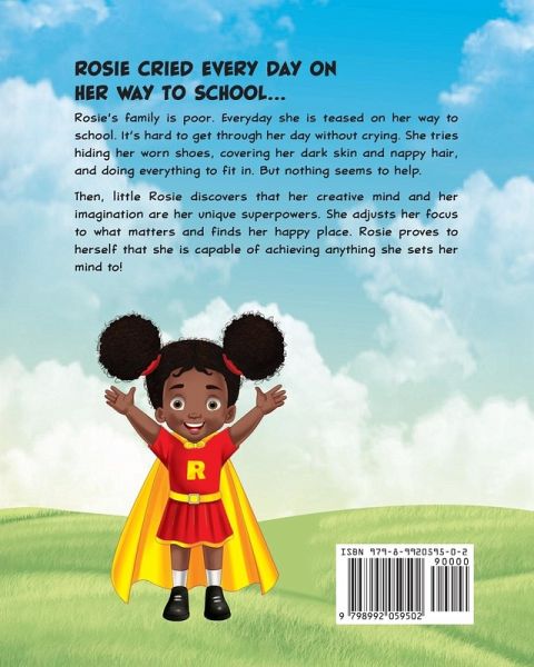 Rosie cried every day on her way to school... Rosie's family is poor. Everyday she is teased on her way to school. It's hard to get through her day without crying. She tries hiding her worn shoes, covering her dark skin and nappy hair, and doing everything to fit in. But nothing seems to help. Then, little Rosie discovers that her creative mind and her imagination are her unique superpowers. She adjusts her focus to what matters and finds her happy place. Rosie proves to herself that she is capable of achieving anything she sets her mind to!