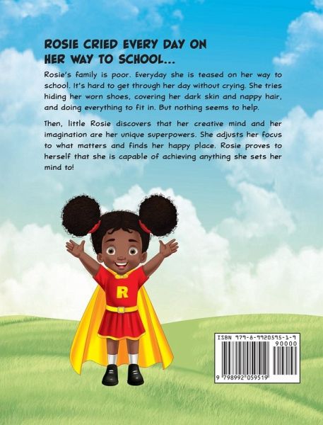 Rosie cried every day on her way to school... Rosie's family is poor. Everyday she is teased on her way to school. It's hard to get through her day without crying. She tries hiding her worn shoes, covering her dark skin and nappy hair, and doing everything to fit in. But nothing seems to help. Then, little Rosie discovers that her creative mind and her imagination are her unique superpowers. She adjusts her focus to what matters and finds her happy place. Rosie proves to herself that she is capable of achieving anything she sets her mind to!