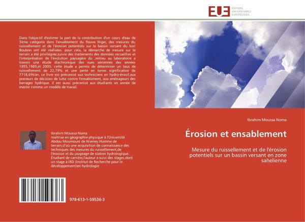 Dans l'objectif d'estimer la part de la contribution d'un cours d'eau de 3ème catégorie dans l'ensablement du fleuve Niger, des mesures du ruissellement et de l'érosion potentiels sur le bassin versant du kori Boubon ont été réalisées. pour cela, la démarche de mesure sur le terrain a été privilégiée,suivie des traitements des données recueillies et l'interprétation de l'évolution paysagère du ,milieu au laboratoire a travers une étude diachronique des vues aériennes des années 1955,1989,et 2009. cette étude a permis de déterminer un taux de ruissellement de 22,79% et une perte en terres significative de 7718,69t/an. ce livre est préconisé aux techniciens en hydro-érosif,aux preneurs de décision de lutte contre l'ensablement, aux aménageurs des barrages hydrique. il est aussi préconisé aux étudiants en année de master comme un modèle de travail.