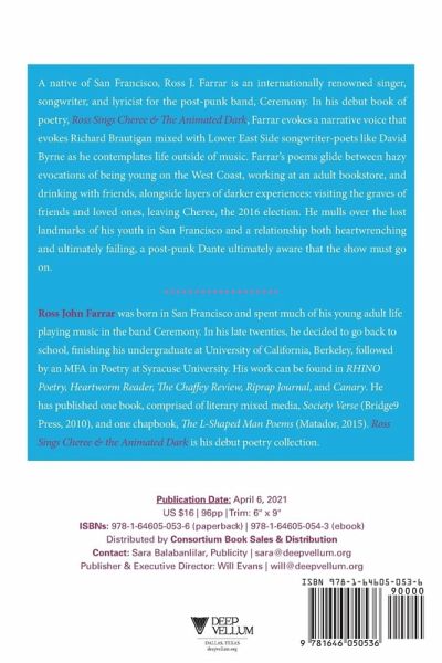 Ross John Farrar was born in San Francisco and spent much of his young adult life playing music in the band Ceremony. In his late twenties, he decided to go back to school, finishing his undergraduate at University of California, Berkeley, followed by an MFA in Poetry at Syracuse University. His work can be found in RHINO Poetry, Heartworm Reader, The Chaffey Review, Riprap Journal, and Canary. He has published one book, comprised of literary mixed media, Society Verse (Bridge9 Press, 2010), and one chapbook, The L-Shaped Man Poems (Matador, 2015). Ross Sings Cheree & the Animated Dark is his debut poetry collection.