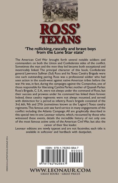 ‘The rollicking, rascally and brave boys from the Lone Star state’ The American Civil War brought forth several notable soldiers and commanders on both the Union and Confederate sides of the conflict. Sometimes the man and the men they led became both exceptional and inextricably linked. The principal character of this book, Confederate general Lawrence Sullivan (Sul) Ross and his Texas Cavalry Brigade were one such outstanding pairing. Ross was a professional soldier who had seen action in the south-west against native American tribes before the war. He was, in fact, during the campaigns against the Comanches, one of those responsible for liberating Cynthia Parker, mother of Quanah Parker. Ross’s Brigade, C. S. A., were not always under the command of Ross, but their success and prowess under his command has linked them forever. Indeed, these cavalry regiments were not always mounted, and served with distinction for a period as infantry. Ross’s brigade consisted of the 3rd, 6th, 9th and 27th (sometimes known as the ‘Legion’) Texas cavalry regiments. This famous unit saw hard service in many engagements of the conflict including the Atlanta Campaign. All are graphically described in this special two-in-one Leonaur volume, which, recounted by those who witnessed these events, details the incredible history of not only one of the most famous active units of the American Civil War, but also the career of their fine leader. Leonaur editions are newly typeset and are not facsimiles; each title is available in softcover and hardback with dustjacket.