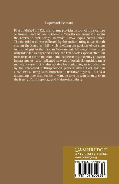 First published in 1928, this volume provides a study of tribal culture on Rossel Island, otherwise known as Yela, the easternmost island in the Louisiade Archipelago, in what is now Papua New Guinea. The material used was collected by the author during a two-month stay on the island in 1921, whilst holding the position of Assistant Anthropologist to the Papuan Government. Although it was originally intended as a general survey, the text devotes special attention to aspects of life on the island that had been insufficiently analysed in past studies - a complicated network of social relationships and a monetary system. It is also notable for containing an introduction by the renowned anthropological pioneer Alfred Cort Haddon (1855-1940), along with numerous illustrative figures. This is a fascinating book that will be of value to anyone with an interest in the history of anthropology and Melanesian cultures.