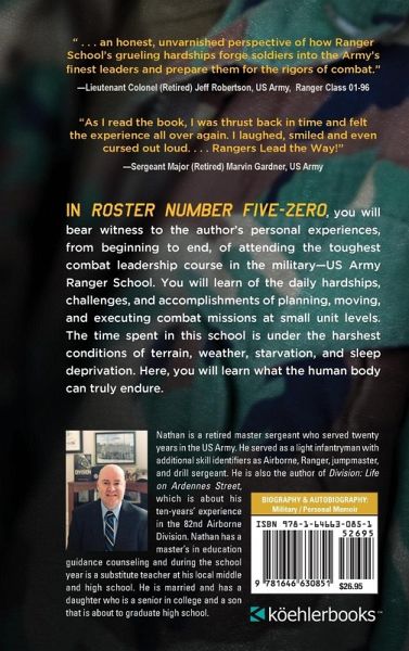 In Roster Number Five-Zero, you will bear witness to the author's personal experiences, from beginning to end, of attending the toughest combat leadership course in the military-US Army Ranger School. You will learn of the daily hardships, challenges, and accomplishments of planning, moving, and executing combat missions at small unit levels. The time spent in this school is under the harshest conditions of terrain, weather, starvation, and sleep deprivation. Here, you will learn what the human body can truly endure.