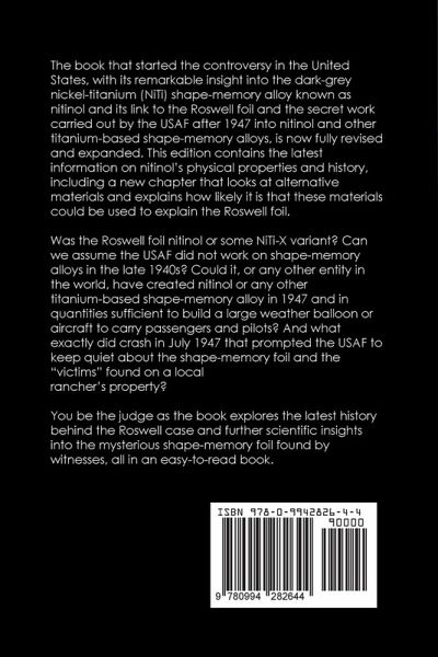 Did you know that a dark-grey nickel-titanium (NiTi) shape-memory alloy known as nitinol was an integral part of the secret USAF work into understanding the Roswell foil in July 1947? Whatever crashed near Roswell had certainly started the USAF's interest into titanium-based shape-memory alloys, with nitinol being the closest to match the Roswell foil in its dark-grey appearance and behaviour, as well as being the world's most powerful shape-memory alloy, and the toughest and lightest of its type and titanium class. Ideal for aerospace applications. Yet, incredibly, the USAF would not use the alloy again (assuming the Roswell crash was part of a US secret military experiment), except only for the most secret spy planes even though presumably it had the technology and knowledge to mass produce it with ease, given the amount of the foil that was found strewn over the desert floor. But why maintain the secrecy on the type of object the USAF had allegedly tested in July 1947 and the materials used when scientists have known about shape-memory alloys, including nitinol, since 1958? What is so special about this object and the alloy itself that the public are not privileged to learn about after all this time? This book gives a summary of the history behind the most famous UFO crash, the essential witnesses' quotes describing what was found, a look at the history of shape-memory alloys, and the type of shape-memory alloys that were available prior to and after 1947 with a special emphasis on U.S. military involvement. The book looks at the evidence and presents, on the basis of probability, how likely the witnesses could have seen something exotic (i.e., alien) based on the available technology to manufacture a titanium-based shape-memory alloy in 1947. Could the USAF have done it? You be the judge by reading this intriguing book.