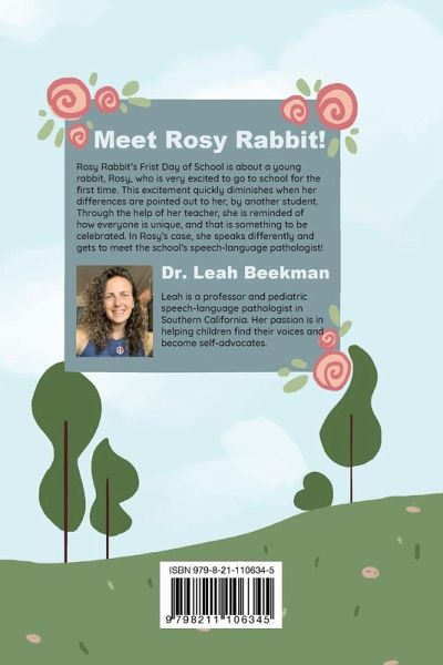 Rosy Rabbit's First Day of School is about a young rabbit, Rosy, who is very excited to go to school for the first time. This excitement quickly diminishes when her differences are pointed out to her, by another student. Through the help of her teacher, she is reminded of how everyone is unique, and that is something to be be celebrated. In Rosy's case, she speaks differently and gets to meet the school's speech-language pathologist. This book is also intended for data collection during therapy sessions.
