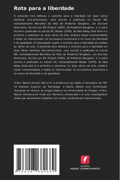 O presente livro delineia o caminho para a liberdade em duas obras literárias afro-americanas, uma escrita e publicada no século XIX, nomeadamente Narrativa da Vida de Frederick Douglass, um Escravo Americano, Escrita por Ele Próprio (1845), de Frederick Douglass, e a outra escrita e publicada no século XX, Raízes (1976), de Alex Haley. Esta tese é a primeira a relacionar as duas obras de arte, embora sejam recomendadas a todos os interessados na escravatura americana e na causa da liberdade e da igualdade. O investigador expõe o caminho para a liberdade em ambas as obras de arte, A presente tese delineia o caminho para a liberdade em duas obras literárias afro-americanas, uma escrita e publicada no século XIX, nomeadamente Narrativa da Vida de Frederick Douglass, um Escravo Americano, Escrita por Ele Próprio (1845), de Frederick Douglass, e a outra escrita e publicada no século XX, nomeadamente Raízes (1976), de Alex Haley. Esta tese é a primeira a relacionar as duas obras de arte, embora sejam recomendadas a todos os interessados na escravatura americana e na causa da liberdade e da igualdade.