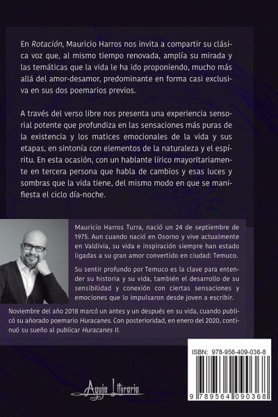 En Rotación, Mauricio Harros nos invita a compartir su clásica voz que, al mismo tiempo renovada, amplía su mirada y las temáticas que la vida le ha ido proponiendo, mucho más allá del amor-desamor, predominante en forma casi exclusiva en sus dos poemarios previos.A través del verso libre nos presenta una experiencia sensorial potente que profundiza en las sensaciones más puras de la existencia y los matices emocionales de la vida y sus etapas, en sintonía con elementos de la naturaleza y el espíritu. En esta ocasión, con un hablante lírico mayoritariamente en tercera persona que habla de cambios y esas luces y sombras que la vida tiene, del mismo modo en que se manifiesta el ciclo día-noche.