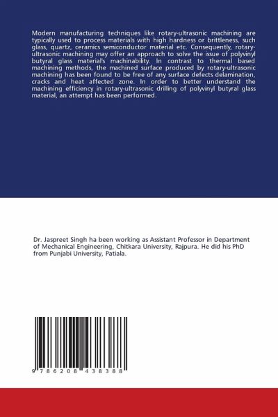 Modern manufacturing techniques like rotary-ultrasonic machining are typically used to process materials with high hardness or brittleness, such glass, quartz, ceramics semiconductor material etc. Consequently, rotary-ultrasonic machining may offer an approach to solve the issue of polyvinyl butyral glass material's machinability. In contrast to thermal based machining methods, the machined surface produced by rotary-ultrasonic machining has been found to be free of any surface defects delamination, cracks and heat affected zone. In order to better understand the machining efficiency in rotary-ultrasonic drilling of polyvinyl butyral glass material, an attempt has been performed.