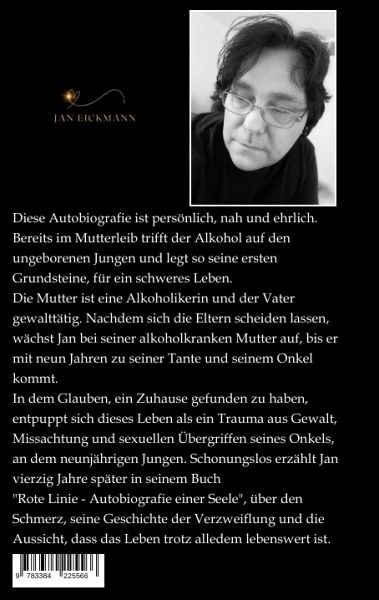 Diese Autobiografie ist persönlich, nah und ehrlich. Bereits im Mutterleib trifft der Alkohol auf den ungeborenen Jungen und legt so seine ersten Grundsteine, für ein schweres Leben.Die Mutter ist eine Alkoholikerin und der Vater gewalttätig. Nachdem sich die Eltern scheiden lassen, wächst Jan bei seiner alkoholkranken Mutter auf, bis er mit neun Jahren zu seiner Tante und seinem Onkel kommt.In dem Glauben, ein Zuhause gefunden zu haben, entpuppt sich dieses Leben als ein Trauma aus Gewalt, Missachtung und sexuellen Übergriffen seines Onkels, an dem neunjährigen Jungen. Schonungslos erzählt Jan vierzig Jahre später in seinem Buch"Rote Linie - Autobiografie einer Seele", über den Schmerz, seine Geschichte der Verzweiflung und die Aussicht, dass das Leben trotz alledem lebenswert ist."Rote Linie - Autobiografie einer Seele" ist ein ergreifendes Werk, das Jans Leben von frühster Kindheit bis heute schonungslos offenbart. Es zeigt den Schmerz, die Verzweiflung und die Hoffnung auf ein lebenswertes Dasein trotz allem.