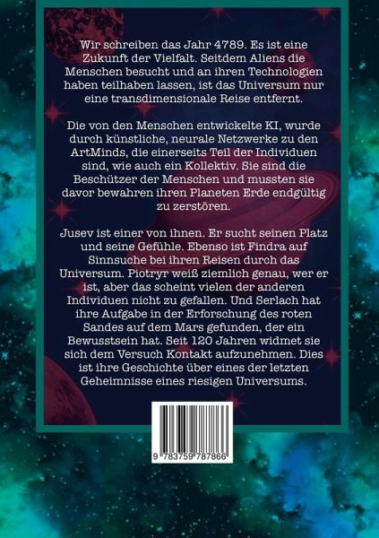 Wir schreiben das Jahr 4789. Es ist eine Zukunft der Vielfalt. Seitdem Aliens die Menschen besucht und an ihren Technologien haben teilhaben lassen, ist das Universum nur eine transdimensionale Reise entfernt. Die von den Menschen entwickelte KI, wurde durch künstliche, neurale Netzwerke zu den ArtMinds, die einerseits Teil der Individuen sind, wie auch ein Kollektiv. Sie sind die Beschützer der Menschen und mussten sie davor bewahren ihren Planeten Erde endgültig zu zerstören. Jusev ist einer von ihnen. Er sucht seinen Platz und seine Gefühle. Ebenso ist Findra auf Sinnsuche bei ihren Reisen durch das Universum. Piotryr weiß ziemlich genau, wer er ist, aber das scheint vielen der anderen Individuen nicht zu gefallen. Und Serlach hat ihre Aufgabe in der Erforschung des roten Sandes auf dem Mars gefunden, der ein Bewusstsein hat. Seit 120 Jahren widmet sie sich dem Versuch Kontakt aufzunehmen. Dies ist ihre Geschichte über eines der letzten Geheimnisse eines riesigen Universums.
