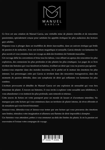Ce livre est une création de Manuel Garcia, une véritable mine de plaisirs interdits et de rencontres passionnées, spécialement conçue pour satisfaire les appétits érotiques les plus audacieux des lecteurs gays adultes.Prépare-toi à te plonger dans un tourbillon de désirs inavouables, dans un univers érotique qui brûle de passion et de séduction. Avec son écriture magnétique et sensuelle, Garcia stimule tes fantasmes les plus secrets, t'emmenant dans un voyage au-delà des frontières de l'intimité masculine.Cet ouvrage défie les conventions et brise tous les tabous, t'offrant un aperçu des rencontres les plus explosives, des connexions les plus profondes et des plaisirs les plus extatiques. Les pages de ce livre révèlent des histoires qui te tiendront collé aux mots, éveillant un désir que tu ne pourras pas ignorer.Laisse-toi emporter dans des mondes inconnus, où le péché est le moteur des émotions les plus intenses. Les personnages créés par García se révèlent dans des rencontrestransgressives, dans des moments de passion débridée, dans une symphonie de désir qui enflamme tes fantasmes les plus sombres.L'écriture provocante et détaillée de Manuel García est une explosion de sensualité qui te fera frissonner de plaisir. À travers ses histoires, il t'invite à explorer ta sexualité sans inhibitions, à t'abandonner à tes instincts les plus profonds, sans remords ni retenue.Cette oeuvre de fiction est ton passeport pour un monde de luxure et d'aventures interdites. Ne manque pas cette lecture qui t'emmènera dans un territoire de plaisir intense, de rêves effrontés et de sensations qui te feront frissonner.Assieds-toi, détends-toi et laisse-toi aller à une lecture qui te procurera des émotions sans limites, stimulera ton imagination et allumera une flamme de désir qui ne peut être apprivoisée.Ces histoires t'attendent, prêtes à t'emmener au-delà des limites du plaisir, là où la passion est souveraine et où l'extase est ton compagnon de voyage.