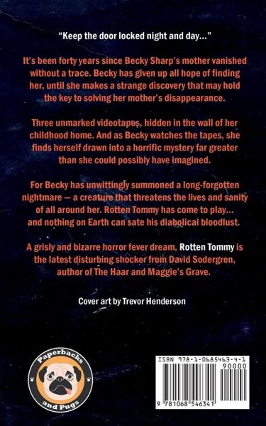 "Keep the door locked night and day..." It's been forty years since Becky Sharp's mother vanished without a trace. Becky has given up all hope of finding her, until she makes a strange discovery that may hold the key to solving her mother's disappearance. Three unmarked videotapes, hidden in the wall of her childhood home. And as Becky watches the tapes, she finds herself drawn into a horrific mystery far greater than she could possibly have imagined. For Becky has unwittingly summoned a long-forgotten nightmare - a creature that threatens the lives and sanity of all around her. Rotten Tommy has come to play... and nothing on Earth can sate his diabolical bloodlust. A grisly and bizarre horror fever dream, Rotten Tommy is the latest disturbing shocker from David Sodergren, author of The Haar and Maggie's Grave.