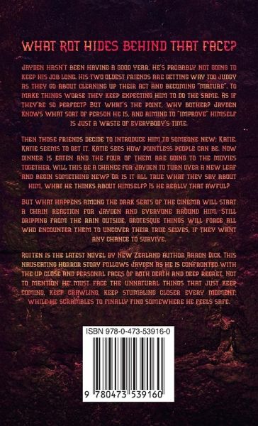 Jayden hasn't been having a good year. He's probably not going to keep his job long. His two oldest friends are getting way too judgy as they go about cleaning up their act and becoming "mature". To make things worse they keep expecting him to do the same. As if they're so perfect? But what's the point, why bother? Jayden knows what sort of person he is, and aiming to "improve" himself is just a waste of everybody's time. Then those friends decide to introduce him to someone new; Katie. Katie seems to get it. Katie sees how pointless people can be. Now dinner is eaten and the four of them are going to the movies together. Will this be a chance for Jayden to turn over a new leaf and begin something new? Or is it all true what they say about him, what he thinks about himself? Is he really that awful? But what happens among the dark seats of the cinema will start a chain reaction for Jayden and everyone around him. Still dripping from the rain outside, grotesque things will force all who encounter them to uncover their true selves, if they want any chance to survive. Rotten is the latest novel by New Zealand author Aaron Dick. This nauseating horror story follows Jayden as he is confronted with the up close and personal faces of both death and deep regret. Not to mention he must face the unnatural things that just keep coming, keep crawling, keep stumbling closer every moment; while he scrambles to finally find somewhere he feels safe.