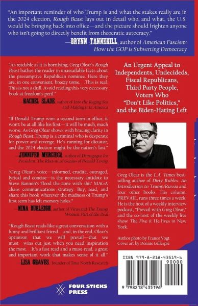 Who is the real Donald Trump? A serial liar with long ties to both organized crime and the Kremlin. A corrupt demagogue whom most historians consider the worst U.S. president of all time. And, most urgently, a vengeful wannabe dictator whose re-election would end American democracy. In this short and necessary volume, Dirty Rubles author Greg Olear presents the facts about FPOTUS: who he is, what he plans to do, and why the country cannot survive a second Trump term. Donald Trump is a Rough Beast. America is slouching towards dictatorship. "As readable as it is horrifying, Greg Olear's Rough Beast bathes the reader in unassailable facts about the presumptive Republican nominee...Here they are, in one convenient, breezy tome...This is real. This is not a drill. Avoid reading this very necessary book at freedom's peril." -Rachel Slade, author of Into the Raging Sea and Making It In America "Rough Beast lays out in detail who, and what, the US would be bringing back into office, and the picture should frighten anyone who isn't going to directly benefit from theocratic autocracy." -Brynn Tannehill, author of American Fascism: How the GOP is Subverting Democracy