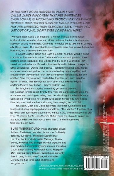 Callie and Cash are back! For fans of Scott Turow, Lee Child, and Raymond Chandler. "When you get out of jail, don't ever come back here."Callie James thought those were the last words she'd ever speak to Cash Logan. Two years later, in Danger in Plain Sight, Callie and Cash become an improbable team taking on lethal adversaries. Now, in Rough Justice, Callie and Cash are back, and their world is about to explode. It's been a year since they saved her ex-husband's life and faced unexpected, terrifying adversaries. During that process-confronting kidnapping, murder, and the destruction of her restaurant-they came together, and against all odds, fell passionately in love. The smooth sailing abruptly ends when Sara, a twenty-five-year-old, half-Algerian woman, unexpectedly shows up at the restaurant and insists on telling them her shocking, unbelievable story. Someone has stolen her identity, and they're trying to kill her. Sara needs their help now, and she has a stunning, life-changing secret to tell. Again, Cash and Callie assemble their unconventional ragtag family-including peg-legged Andre, and Itzac, "the Macher." Together, they go to war with formidable adversaries to save Sara and ultimately their own lives. The fierce global battle leads them to Cuba, where they launch an audacious offensive that shocks even them...and will absolutely take your breath away. With Rough Justice, Burt Weissbourd elevates not only his deeply rich and complex characters, but the entire thriller genre.