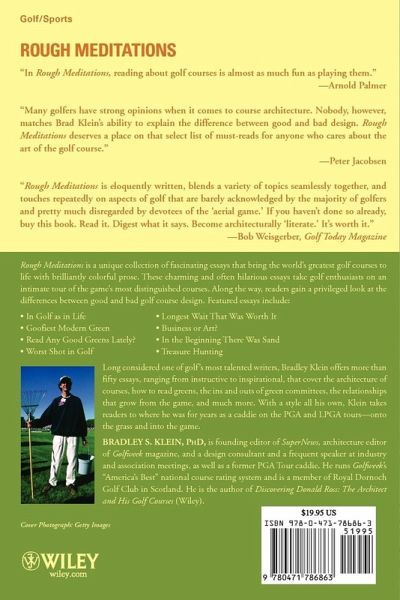 In Rough Meditations, Golfweek Architecture Editor Bradley Klein weaves engaging and often hilarious essays as he takes readers on a tour of golf course architecture and explains the difference between good and bad golf course design. He recounts his exploits as a caddy on the PGA and LPGA tours, tells a heartwarming tale about introducing his daughter to the game, and much more. In his charming style, Bradley liberally accents his stories with personal wisdom on the game, including how to look at a greens grass and slope to judge speed, distance, and placement of a putt. Bradley S. Klein (Bloomfield, CT) is the Founding Editor of Superintendent News, Architecture Editor of Golfweek magazine, where he runs the magazines ' Americas Best' national course rating system.