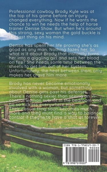Professional cowboy Brody Kyle was at the top of his game before an injury changed everything. Now if he wants the chance to win he needs the help of horse trainer Denise Shaw. But when he's around this strong, sexy woman the gold buckle is the last thing on his mind. Denise has spent her life proving she's as good as any man. Nothing fazes her. So what is it about Brody that instantly turns her into a giggling girl and sets her blood on fire? She needs some time between the sheets to get him out of her system. Unfortunately, the heat between them only makes her crave him more. Brody has never become emotionally involved with a woman, but something about Denise gets past his defenses. There's nothing sexier than seeing an in-control woman submit in the bedroom and be so kickass everywhere else. Their casual fling soon becomes much more and they must find a way to balance control if they're to have a shot at forever.