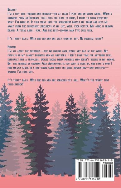 Blakely I'm a city girl through and through-or at least I play one on social media. When a comment from an internet troll hits too close to home, I decide to show everyone what I'm made of. If this foray into the wilderness boosts my brand and gets me away from the oppressive loneliness of my life, well, all the better. My guide is grumpy. Brash. A total assh...jerk. And the best-looking man I've ever seen. It's thirty days. With one bed and one sexy country boy. No problem at all, right? Hudson I'm all about the outdoors-give me nature over people any day of the week. My focus is on my family business and my brothers. I don't have time for anything else, especially not a frivolous, spoiled social media princess who doesn't belong in my woods. But the promise of growing Peak Adventures is too good to pass up, and that's how I find myself stuck in a one-room cabin with the most infuriating-and beautiful-woman I've ever met.
