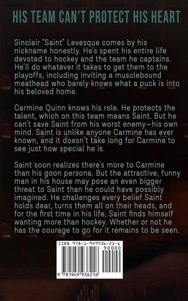 Sinclair "Saint" Levesque comes by his nickname honestly. He's spent his entire life devoted to hockey and the team he captains. He'll do whatever it takes to get them to the playoffs, including inviting a musclebound meathead who barely knows what a puck is into his beloved home. Carmine Quinn knows his role. He protects the talent, which on this team means Saint. But he can't save Saint from his worst enemy-his own mind. Saint is unlike anyone Carmine has ever known, and it doesn't take long for Carmine to see just how special he is. Saint soon realizes there's more to Carmine than his goon persona. But the attractive, funny man in his house may pose an even bigger threat to Saint than he could have possibly imagined. He challenges every belief Saint holds dear, turns them all on their heads, and for the first time in his life, Saint finds himself wanting more than hockey. Whether or not he has the courage to go for it remains to be seen.