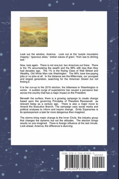It is the run-up to the 2016 Presidential election. The bitterness in Washington is worse than ever. A sudden series of superstorms has created a pervasive fear but nothing is done. Unnoticed, a campaign develops based upon Theodore Roosevelt's governing principles which are as relevant today as a century ago coupled with a radical way to change the Executive Branch. The Campaign uses social media and elected representative analyses to create commitment especially with Millenials who are searching for the American Dream but being denied. The campaign choses Emily Esperantes to be its spokesperson, a task far more dangerous than imagined. The Republican Party and Wealthy, Old, White Men refuse to change so the campaign becomes a new party, AR4-21C (A Roosevelt for the 21st Century). The outcome of the election is influenced by a foreign power and the power of the people. It is stunning.