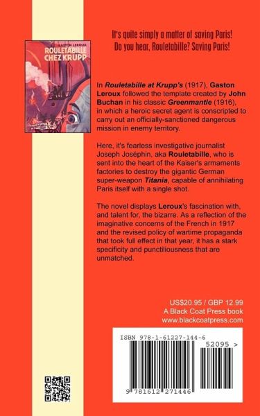 In Rouletabille at Krupp's (1917), Gaston Leroux followed the template created by John Buchan in Greenamtle (1916), in which a heroic secret agent is conscripted to carry out an officially-sanctioned dangerous mission in enemy territory. Here, it's fearless investigative journalist Joseph Josephin, aka Rouletabille, who is sent into the heart of the Kaiser's armaments factories to destroy the gigantic German super-weapon Titania, capable of annihilating Paris itself in a single shot. The novel displays Leroux's fascination with, and talent for, the bizarre. As a reflection of the imaginative concerns of the French in 1917 and the revised policy of wartime propaganda that took full effect in that year, it has a stark specificity and punctiliousness that are unmatched.